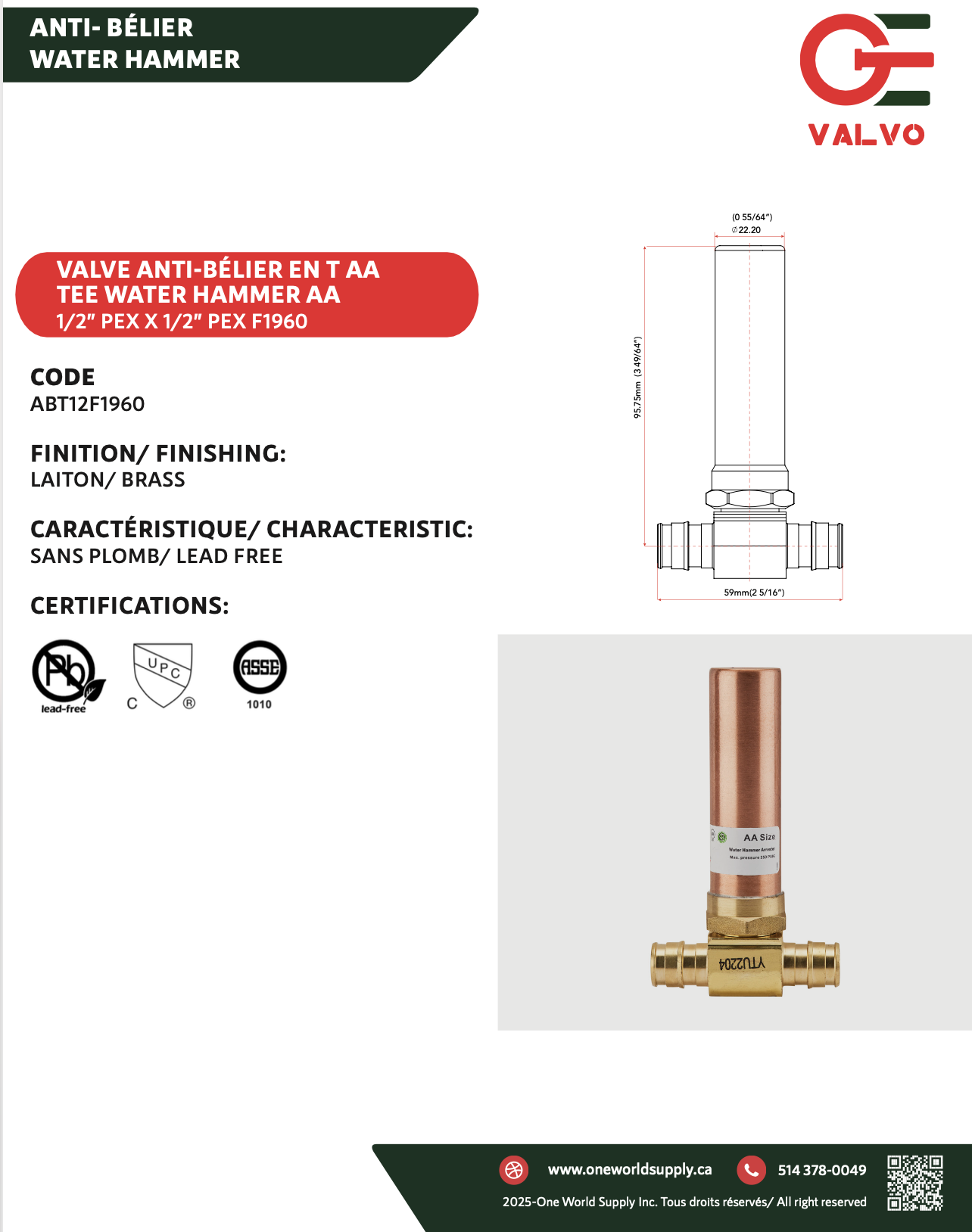 • Type: Copper water hammer arrestor, size AA
