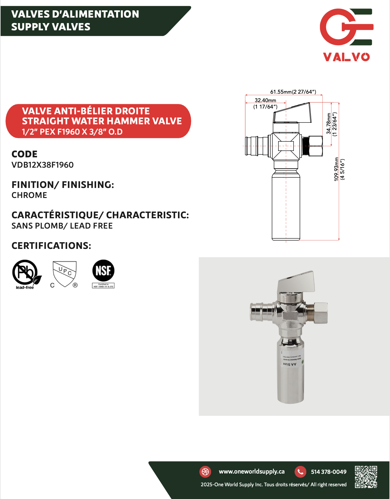 The water hammer valve Valvo™ is designed to effectively prevent damage to plumbing systems by reducing excessive water pressures. It protects your fittings, appliances and piping while eliminating unwanted noise caused by water hammer. Its rust- and corrosion-resistant chrome finish ensures optimum durability, even in harsh conditions, extending the life of your system’s essential components. Valvo™the guarantee of reliable, long-lasting plumbing.