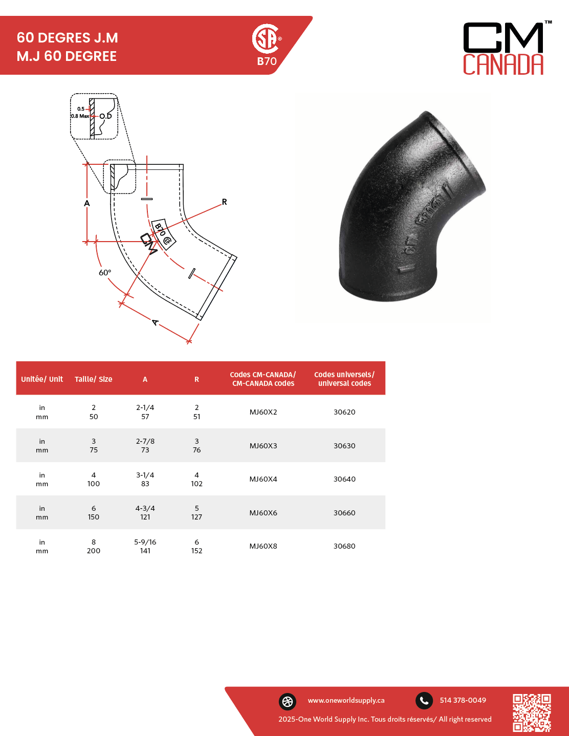 Le coude à 60 degrés en fonte noire CM-CANADA™ est une solution de raccordement de haute qualité pour vos installations de tuyauterie. Capable de supporter une pression maximale de service de 150 psi, il offre une résistance au feu et contribue à la diminution du bruit pour un fonctionnement fiable et silencieux. Grâce à un revêtement protecteur, il présente une excellente résistance à la corrosion, tout en assurant une solidité remarquable et un faible taux de dilatation thermique pour une longévité optimale. Fabriqué à partir de 100 % de contenu recyclé, ce coude allie performance et respect de l’environnement.