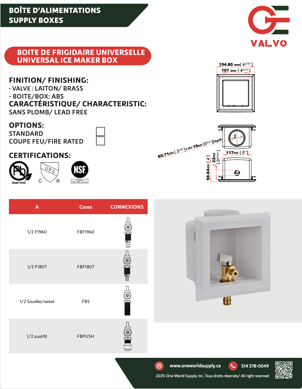 - Boîtiers d’alimentation pour réfrigérateur Valvo™ : Incluent une valve Valvo™ LF de 1/2 po.