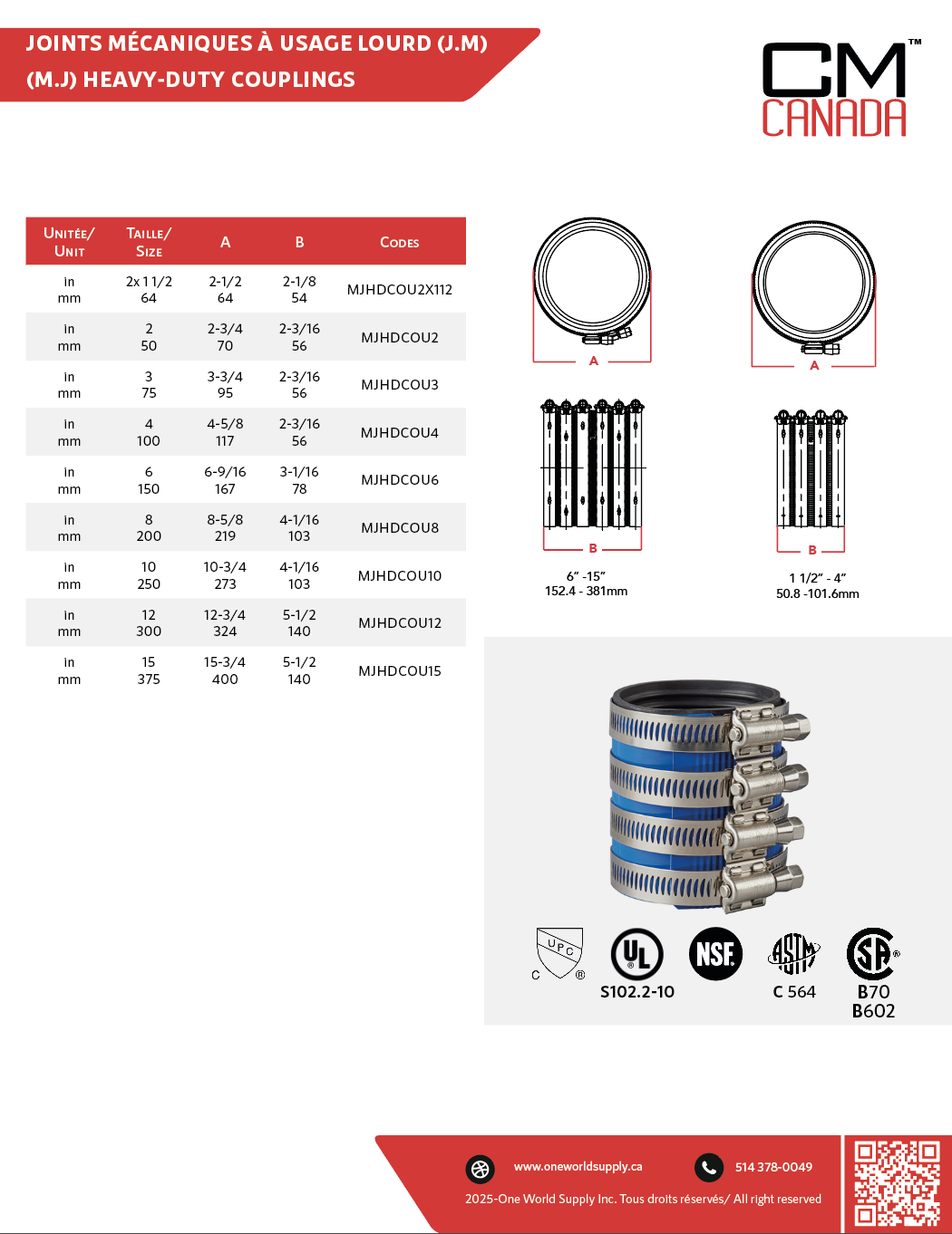 Le joint mécanique CM-CANADA™ est conçu pour joindre les tuyaux en fonte, en plastique ou en acier avec ceux en cuivre ou en plastique dans les systèmes de drainage, de renvoi et de ventilation. Équipé d’un joint d’étanchéité en néoprène (caoutchouc) certifié CSA, ainsi que d’un manchon et de colliers de serrage en acier inoxydable, il assure une connexion étanche et fiable. Son joint en élastomère offre une flexibilité optimale, une durabilité accrue et une résistance exceptionnelle à la corrosion. De plus, il ne nécessite aucun outil spécial, ni colle, filetage ou soudage, et tolère efficacement les défauts d’alignement, ce qui en fait la solution idéale pour les nouvelles installations, les réparations et les modifications.