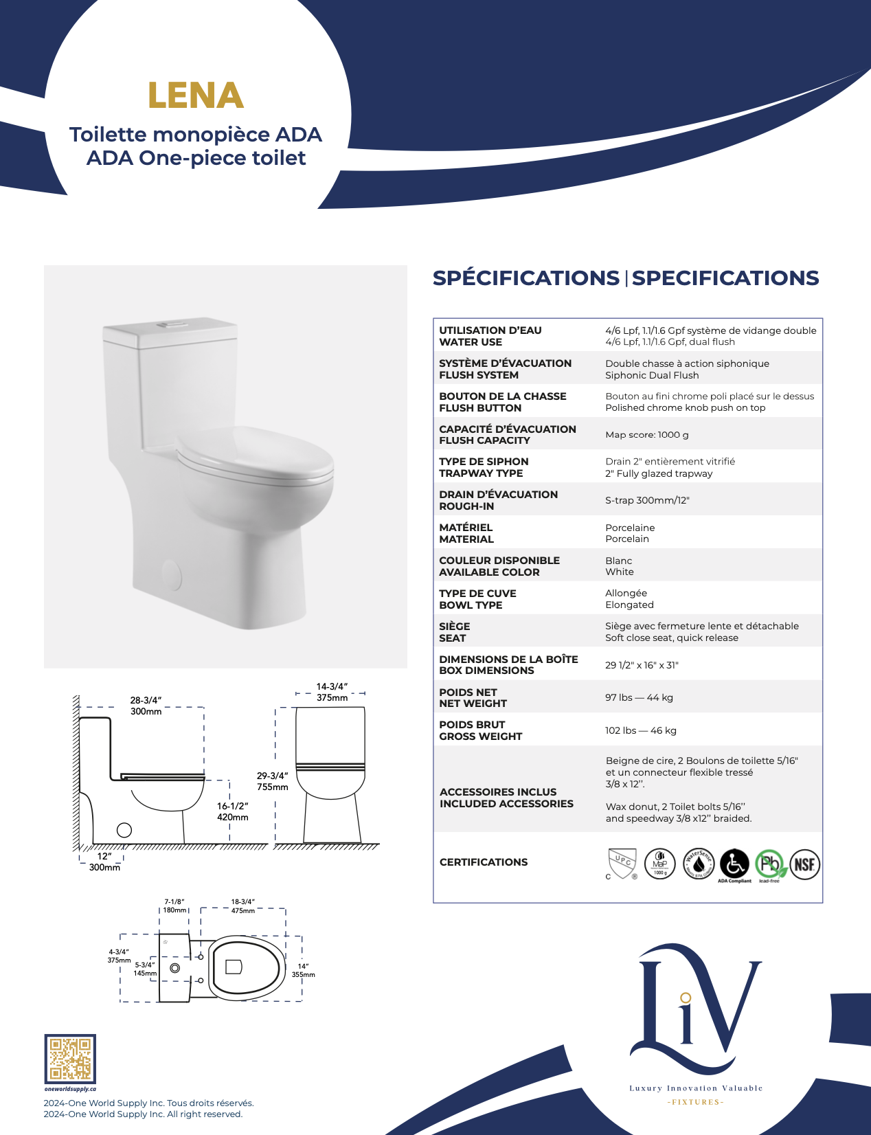 Liv fixtures™ vous propose une toilette monopièce, un monobloc de montage au sol alliant qualité et fiabilité. Conçues pour résister à une utilisation quotidienne intensive, nos toilettes sont fabriquées avec des matériaux robustes et durables. Leur système de chasse d’eau à double débit permet d’optimiser la consommation d’eau tout en assurant une puissance de rinçage optimale, offrant ainsi des performances élevées et des économies substantielles.