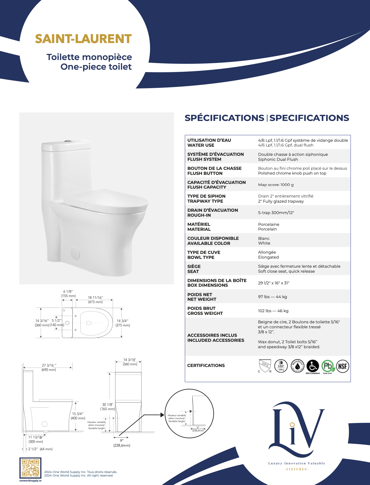 Liv fixtures™ vous propose une toilette monopièce, un monobloc de montage au sol qui incarne le confort ultime et une hygiène exceptionnelle. Conçues avec un soin méticuleux et fabriquées à partir de matériaux durables, nos toilettes offrent une expérience de salle de bain supérieure. Leur design moderne et élégant s’intègre harmonieusement à tout type de décor, alliant esthétique et fonctionnalité pour transformer votre espace en un véritable havre de bien-être.