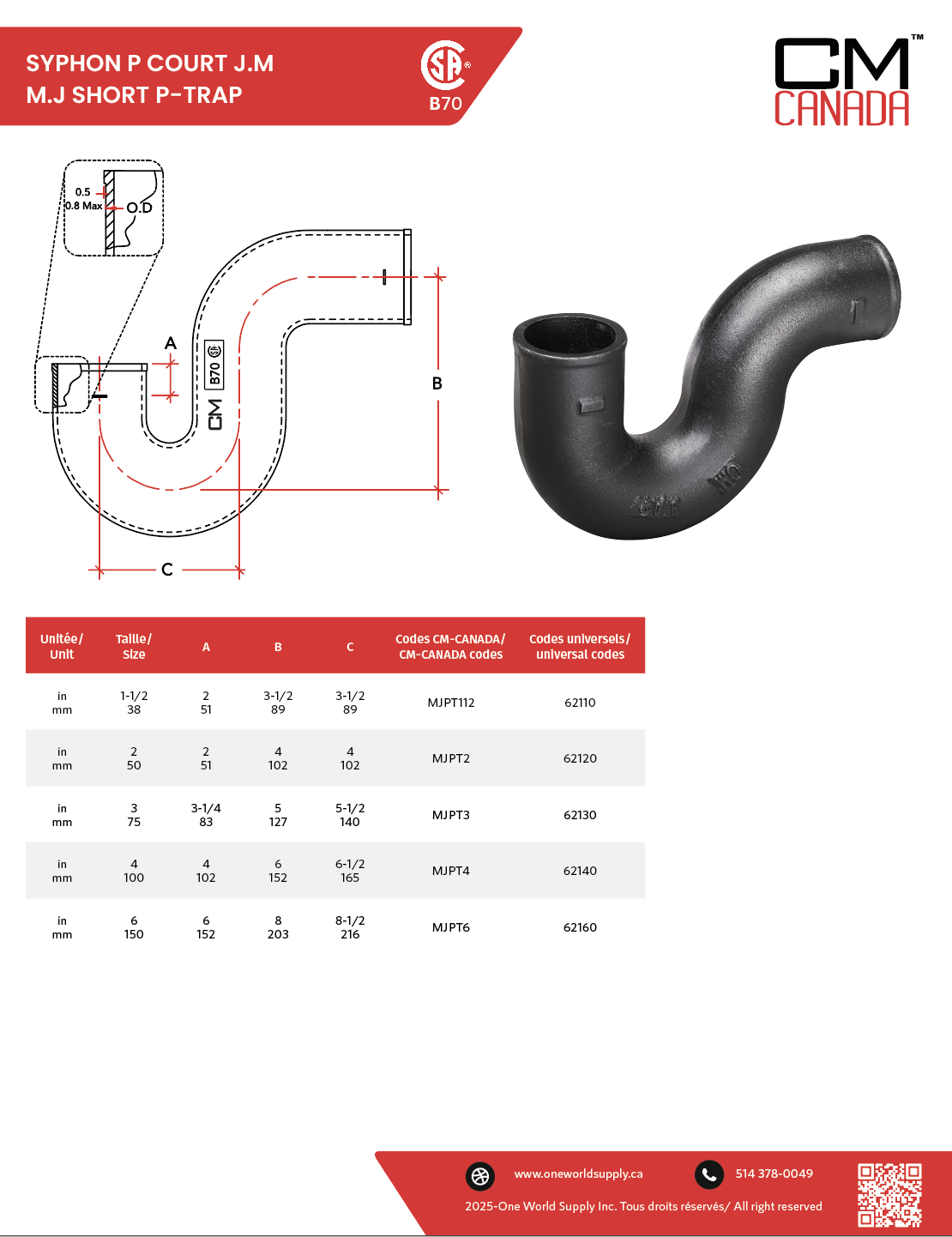 Le Syphon P court en fonte noire CM-CANADA™ est un composant de drainage de haute qualité, conçu pour assurer une performance optimale dans vos installations de tuyauterie. Capable de supporter une pression maximale de service de 150 psi, il offre une résistance au feu et contribue à la diminution du bruit. Grâce à son revêtement protecteur, il résiste efficacement à la corrosion, garantissant ainsi une solidité remarquable, un faible taux de dilatation thermique et une longévité exceptionnelle. Fabriqué à partir de 100 % de contenu recyclé, le SYPHON P COURT allie performance, durabilité et respect de l’environnement