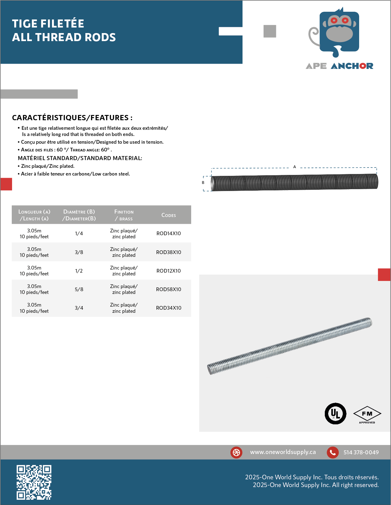 Apeanchor™ vous propose une Tige filetée Apeanchor™ de 10 pieds, spécialement conçue pour être utilisée en tension. Fabriquée en acier robuste, elle assure une résistance mécanique élevée et bénéficie d’une finition plaquée zinc qui offre une protection contre l’humidité, l’air et la corrosion. Compatible avec divers raccords, écrous et fixations, cette tige filetée polyvalente est idéale pour les applications de construction, de plomberie et d’électricité.
